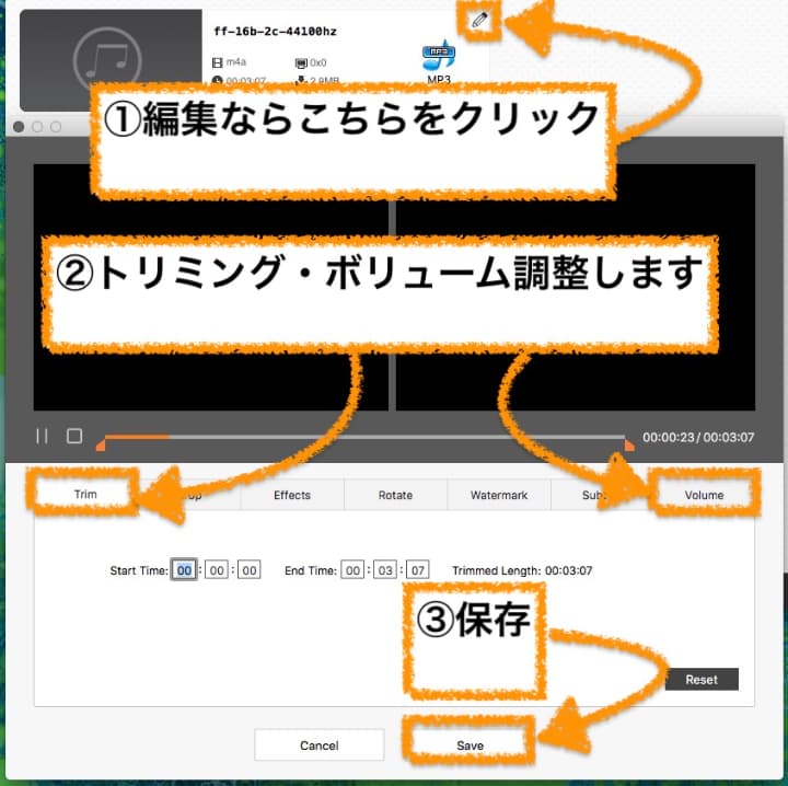 注意:M4Aファイルを予め編集したい場合、ファイルを取り入れた後でふファイル情報の右上の鉛筆マークをクリックして、「Trim」タブでトリミングでき、「Volume」タブで音量の調整とフェードイン・フェードアウト効果の追加ができます。