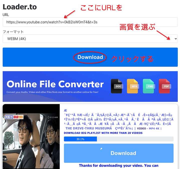 2160pのYouTube動画をダウンロードしたい場合、オンラインダウンローダーを使うのも悪い手段でもありません。ソフトをインストールする必要がないし、動画リンクさえあればいつどこでも自由にダウンロードできます。今まで私がよく使っているオンラインダウンローダーは「Loader.to 」です。