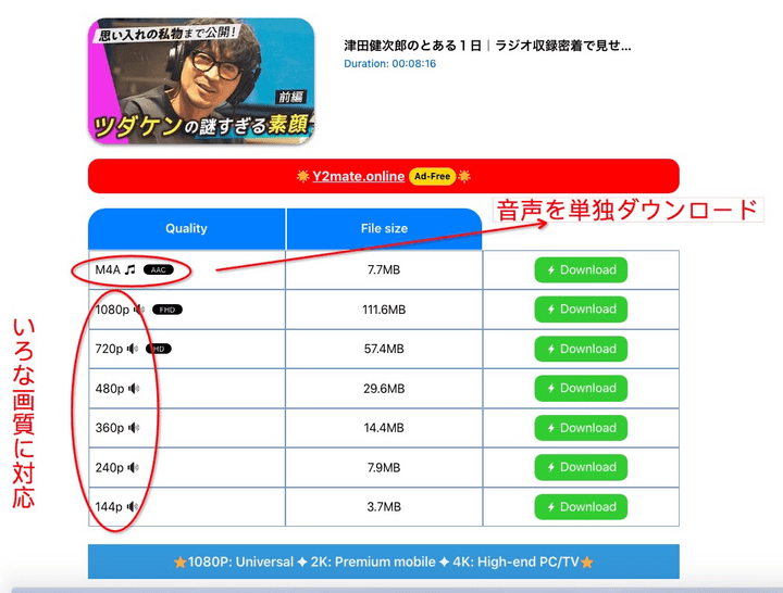 これもまたオンラインダウンローダーの一つです。ssyoutube.onlineは処理速度が速いという優勢があって、100MBサイズの動画はほぼ秒で処理できる。しかもDLBunnyに似て、音声を単独に抽出することができ、オリジナルの動画画質に応じて最大2160pの画質で動画をダウンロードできます。手順も単純でわかりやすい。