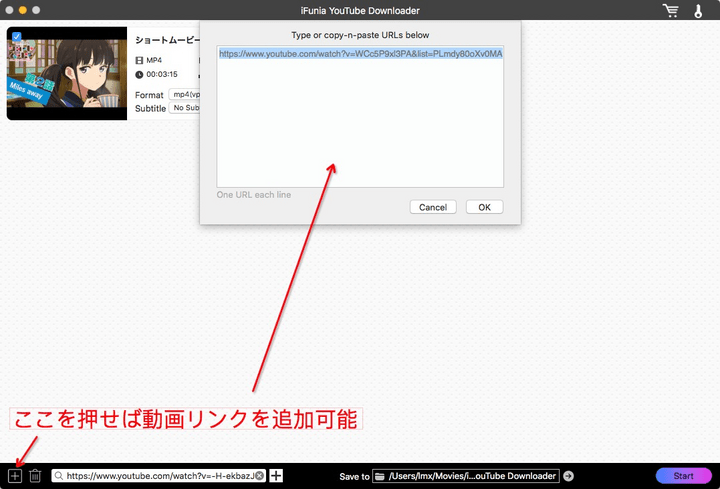 5.コツ: ステップ3を実行する時、左下にある「+」のボタンをクリックし、複数のURLを入力すれば、動画導入は一度に終わリます