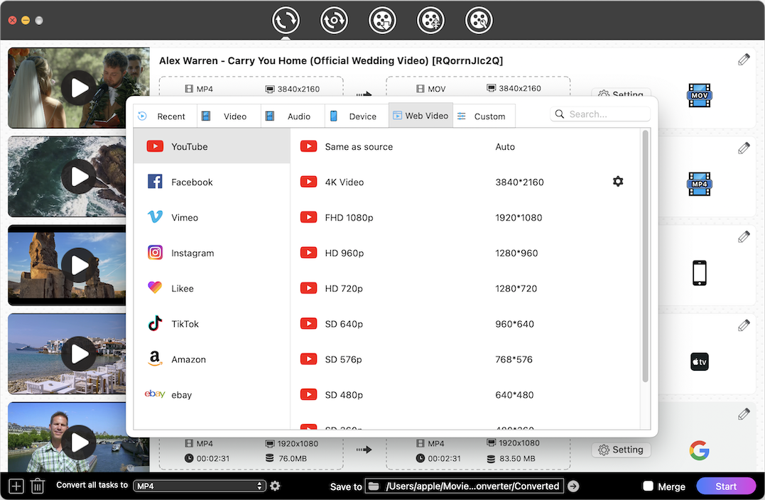 3840x2160・4096x2160・5120x2160の4Kビデオを自由に変換できます。さらに、4Kから1080P・720P・SDへの格下げもできます。