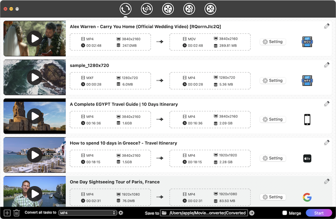 動画から動画への変換をMP4・AVI・MKV・MOV・MXF・WMV・MPEG・FLVなど、ほとんどの動画フォーマットの間にハイスピードでできます。