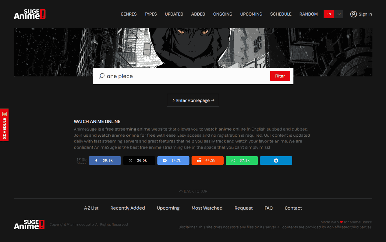 Animesuge is a fantastical anime land where you can watch and download for free. You can watch all kinds of anime with fast streaming and almost without interrupting ads. It updates daily and allows one to view subbed and dubbed English anime with high quality.