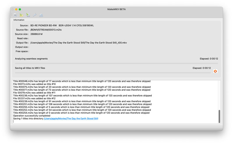 As it doesn’t compress, MakeMKV produces larger files than other ripping programs, so make sure you have enough space on the hard disk: count on about 24.6Gb!