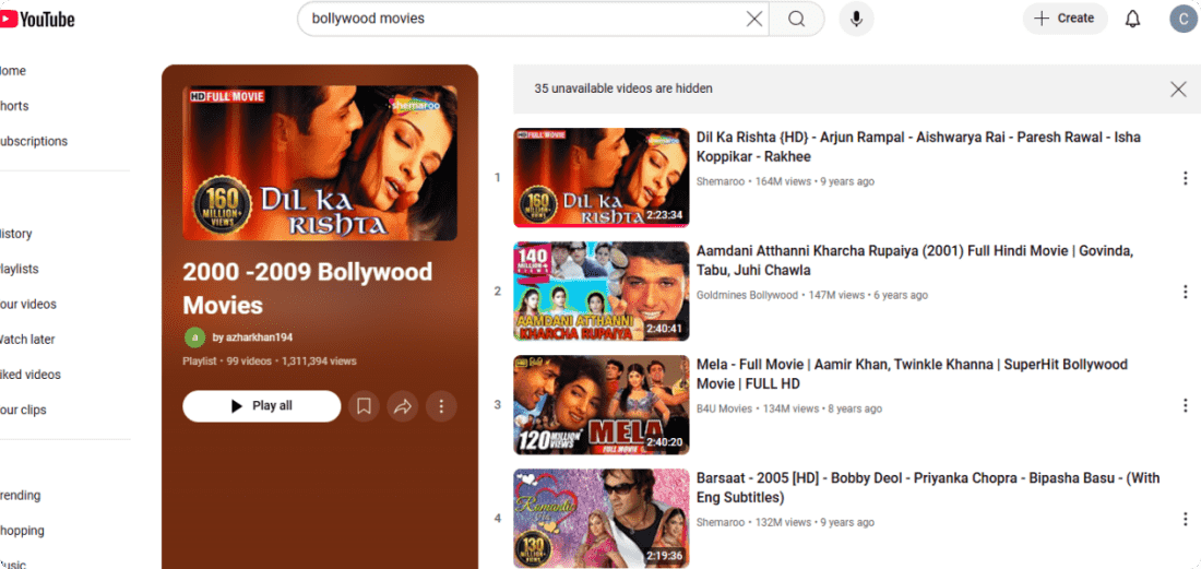 YouTube is a perfect platform to free stream Bollywood movies in the best quality like 4K. Both productions and personal users have YouTube channels to upload Hindi movies, especially old Bollywood films. When looking for full-length movies on YouTube with captions, you can use the search filters to find the movie you want.