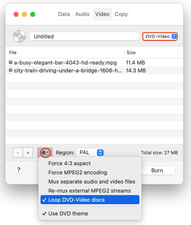 5. Choose the output as "DVD-Video". Below, press on the gear icon, or choose Preferences from the Burn tab on the upper menu to define other settings.