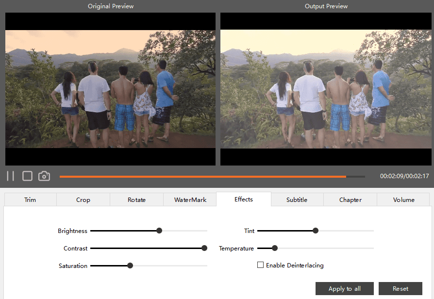 Effects: in this part, you can adjust the brightness, temperature and saturation of the pictures. It enables to lighten dark images and even deinterlaing (converting interlaced video into a progressive and clearer video format.)