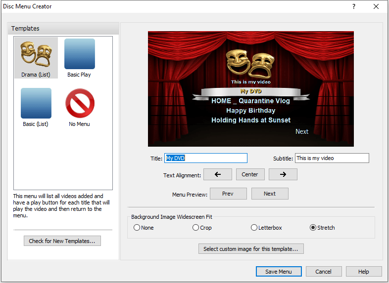4. Click “Create Menu” to open the menu creator window, where you can choose a DVD menu template. It offers three simple built-in templates, and you can only make minor adjustments, like background image and title/subtitle.