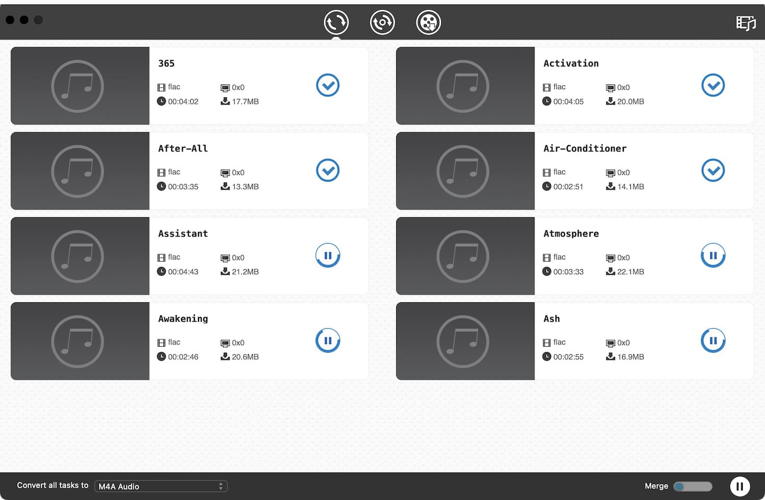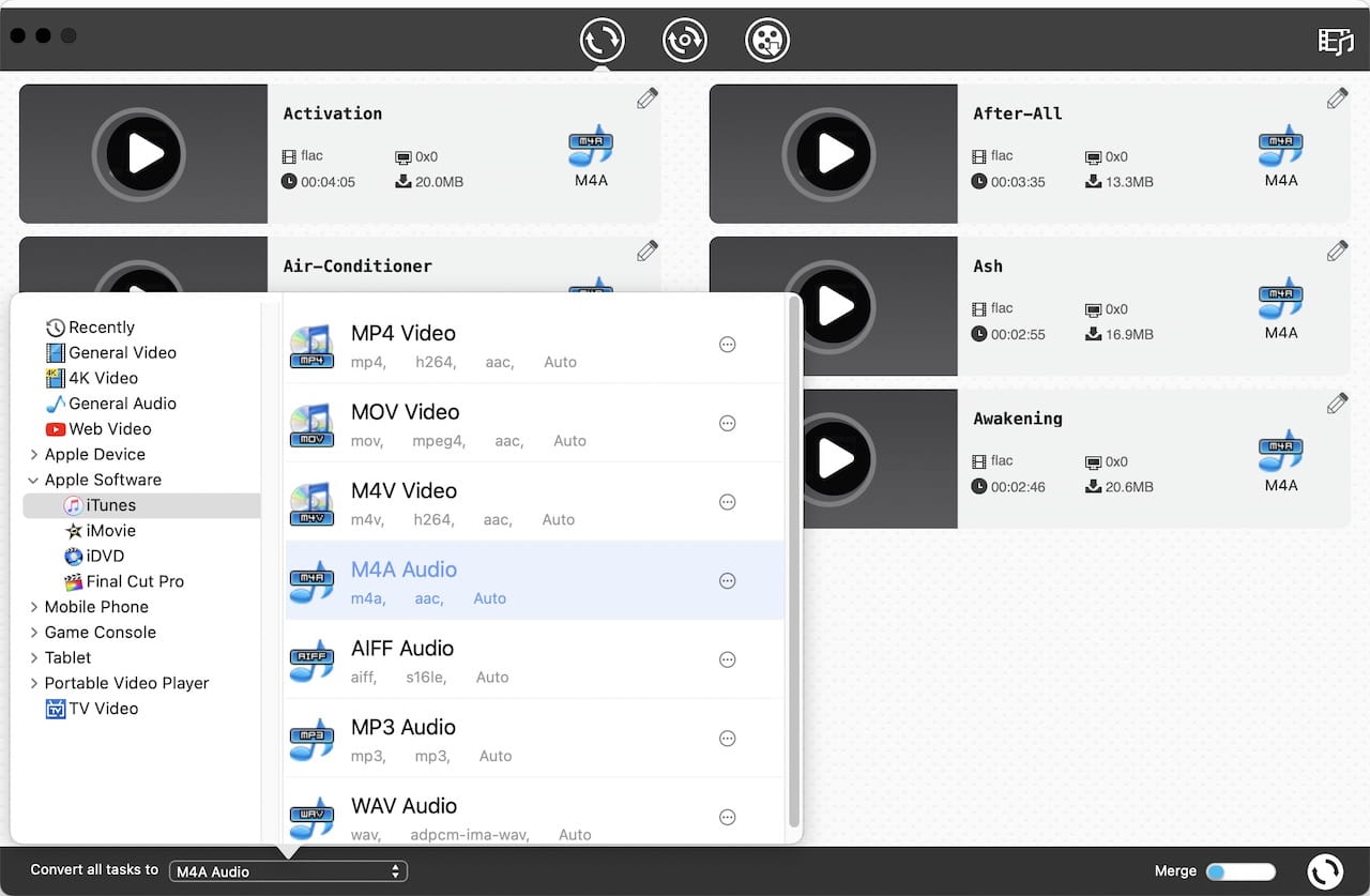 iFunia Video Converter is a dedicated video and audio converter application for Windows & Mac that is able to convert between hundreds of codecs and formats, including FLAC, ALAC, AAC, WAV, AIFF, OGG, MP3 and more. It lets you convert unlimited FLAC files to ALAC simultaneously with a few clicks and merge multiple files into one if needed.