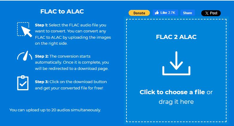 If you just need to convert a few FLAC files and don’t want to install any software, online FLAC to ALAC converters are handy options, but they compromises on speed and security. Online tools will take a rather long time to upload a FLAC file and convert it to ALAC will take another few minutes. Converter.app is one of the online audio converters that supports converting to lossless formats like ALAC. It’s easy to use and the ads are not too intrusive.