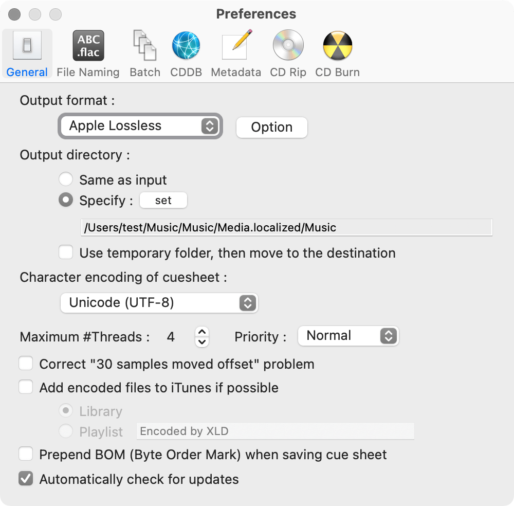 Step 2. Go to XLD > Settings to set it up. Choose “Apple Lossless” from the “Output format” drop-down list, and specify a directory to save the output files.