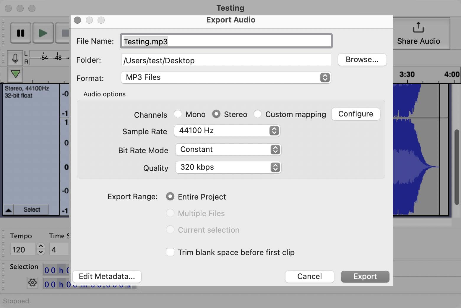 4. Go to the File tab again and click "Export Audio...", it will pop up a new dialogue box.