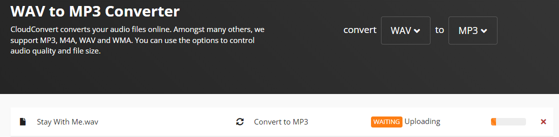 This tool will convert WAV to MP3 with the best quality by default (320 Kbps). If you want to degrade a little bit the quality to have a smaller file size, click the three-dot icon