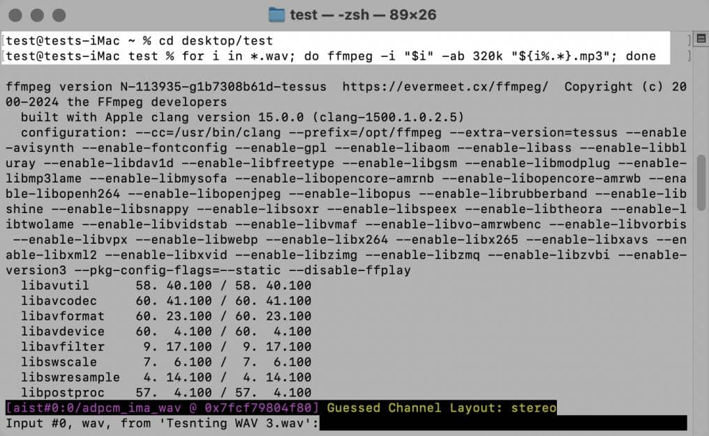 3. Use the "-i" option to refer to the WAV file, and "-ab" to specify the audio bitrate. For example, if I want to convert WAV to MP3 at 320 kbps, type and run: