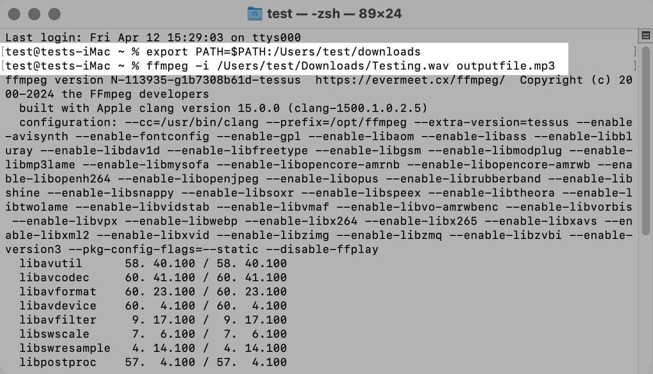 2. Open the Terminal app, add the directory to the path variable. For example, if the FFmpeg file is in /Users/test/downloads, type and run: