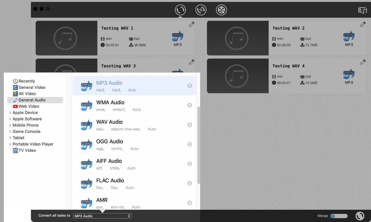 3. Set MP3 as the output format. Click "Convert all tasks to" at the bottom left and switch to the "General Audio" tab in the pop-up window, then select "MP3 Audio" from the list.