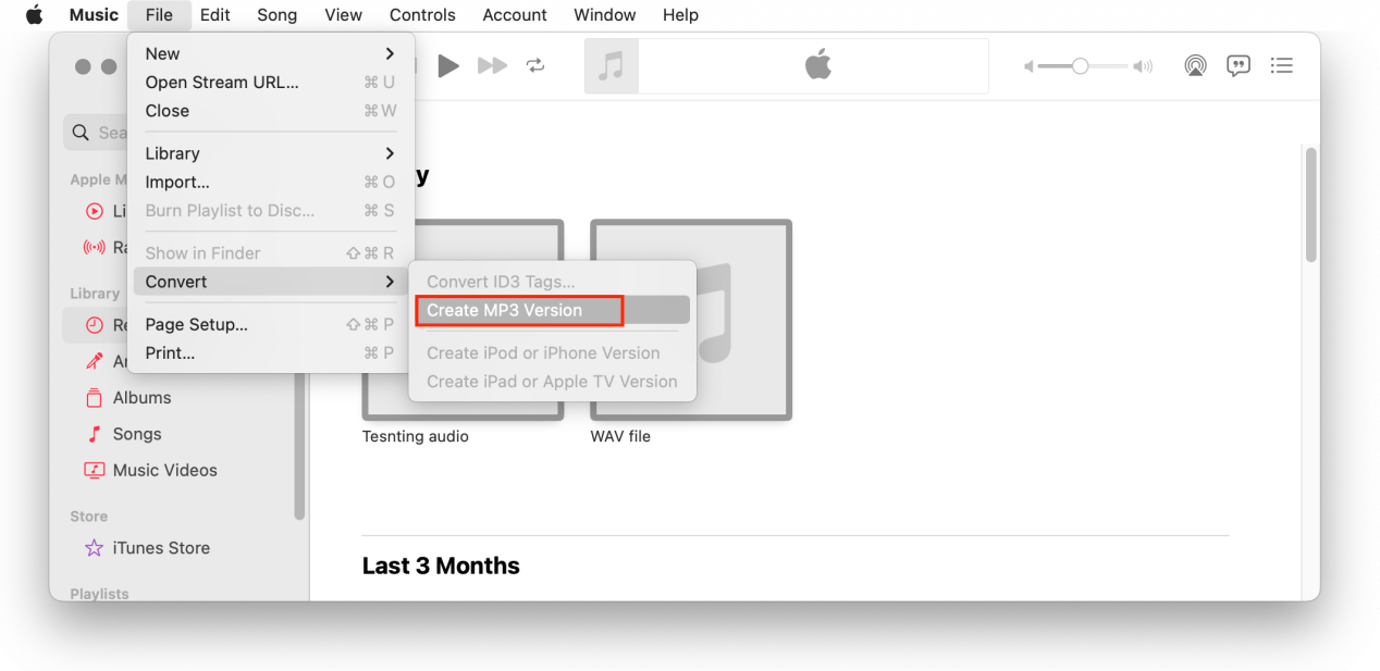 Both WAV and MP3 are supported formats on Mac, so you can convert WAV to MP3 and vice versa in iTunes (now Music) without using a third-party app. It will create an MP3 version of the WAV file in your music library. iTunes has been integrated into Music since macOS Catalina, so here's a how-to guide for macOS 10.15+: