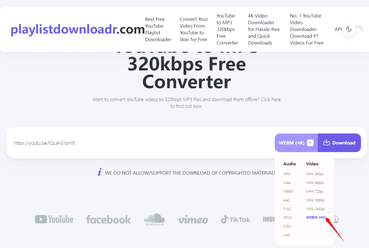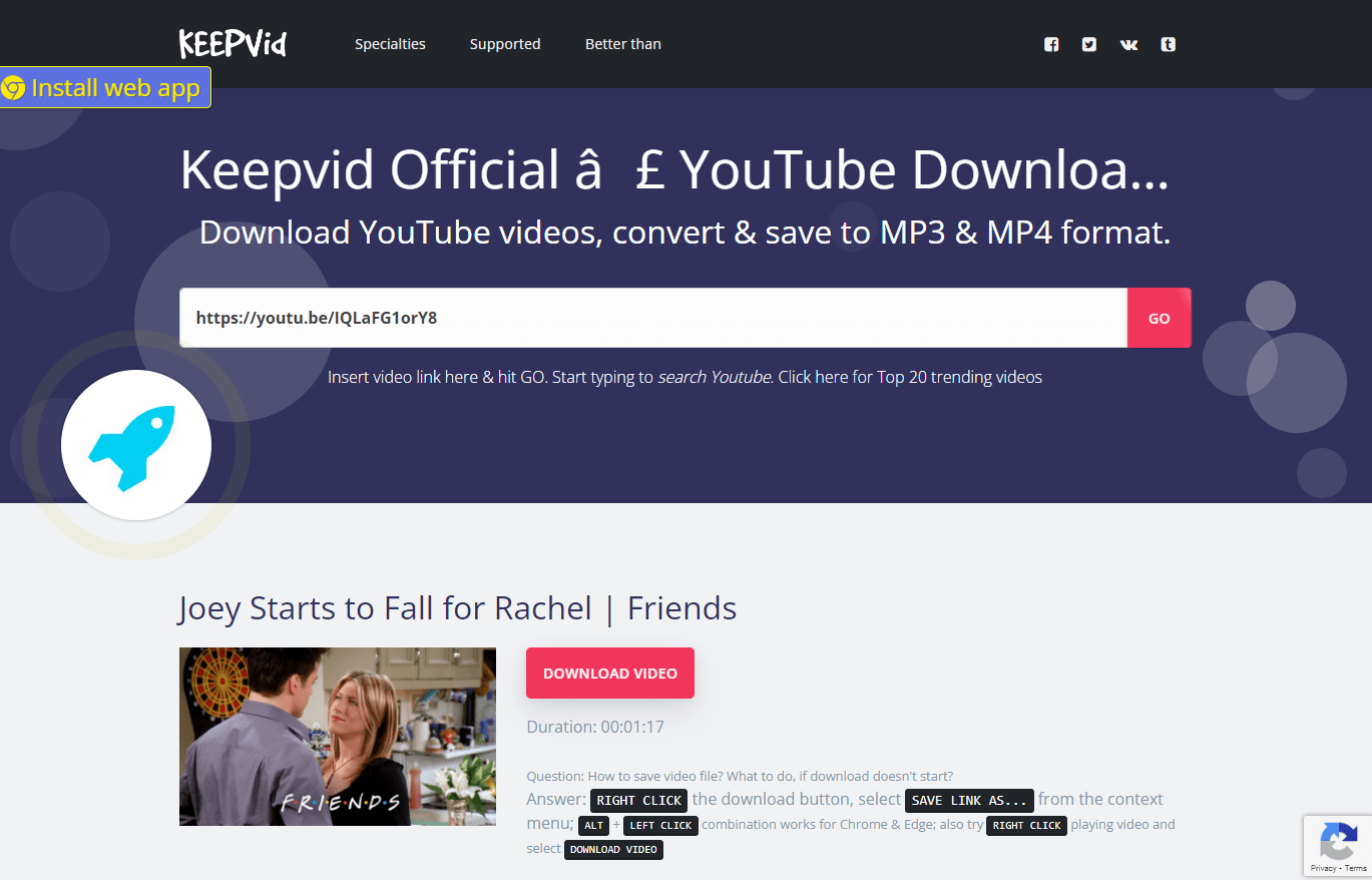 Keepvid is an online video and audio download platform with a mp3 downloader. It allows to convert videos to WebM format and upload videos to YouTube, FaceBook, and Instagram.