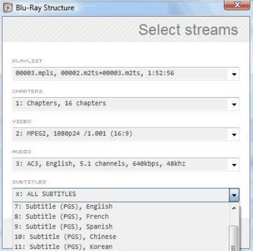 In the playlist, choose the longest which is the main movie. In other options, select a proper one and click OK. It will take about half to an hour to demux and split the video, audio, and subtiiles into different files.