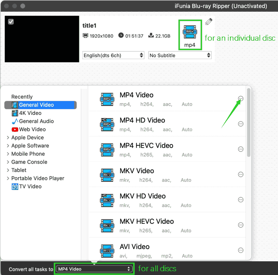 From the bottom bar, you can convert all the discs, and by hitting on the button beside the disc information you can choose for a single disc. As you can see, there are a great amount of options for you to select from.