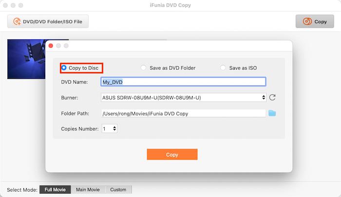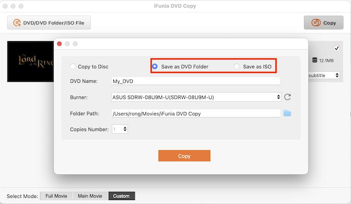 button to bring up a new window. Select “Save as DVD Folder” or “Save as ISO” to save the copied file to computer. And click “Copy” to begin the process. (If you have two DVD drives connected to your Mac, select “Copy to Disc” here to copy the DVD directly to another one on the fly.)