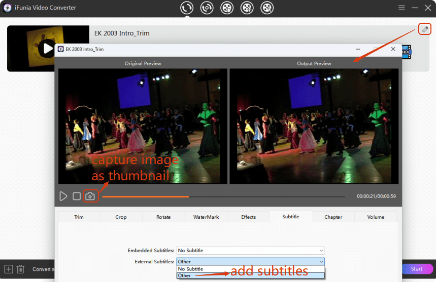 - Make full use of the built-in editing tool by clicking the pencil icon to trim, crop, add effects and subtitles to your videos as you need.