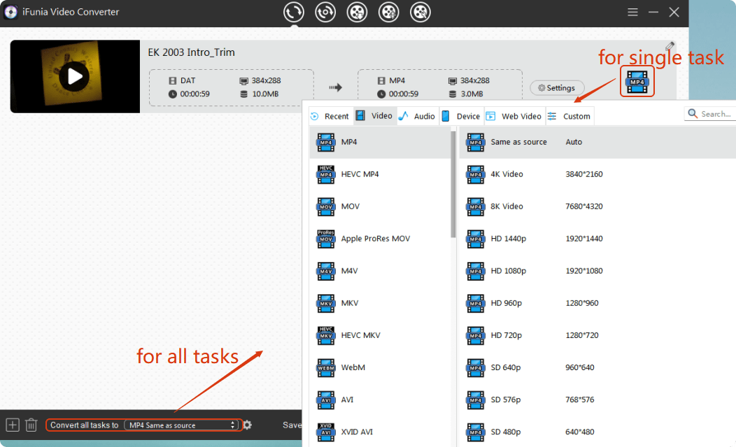- Once input all the DAT files, choose the output format as MP4 with a resolution (e.g. SD, HD, 4K) you want. There are two ways to choose format, to select separately for a single video, click the format icon beside the video, to select for all videos, hit on the bar below.