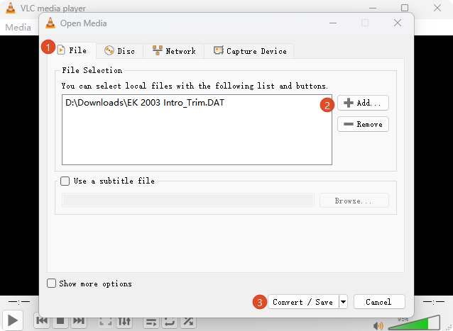 - In the popping up dialogue, under the File tab, Add the DAT file into the program and click Convert / Save.