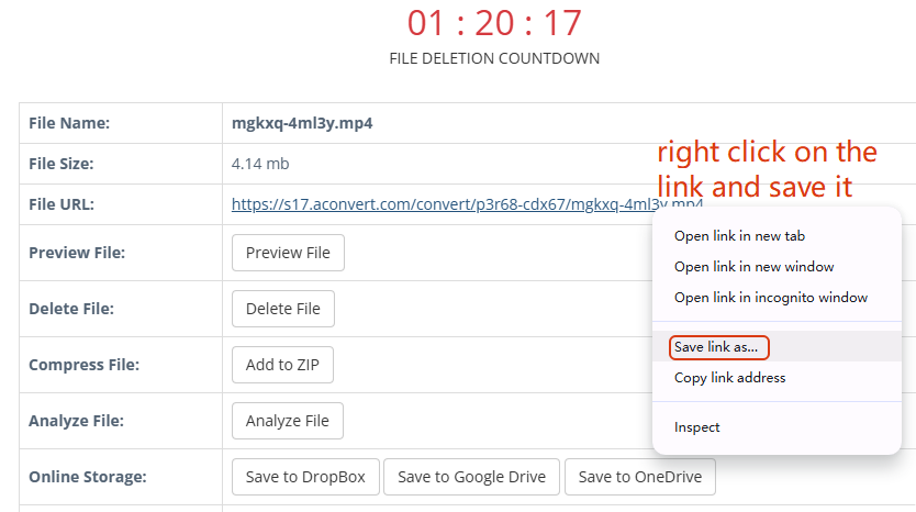 - In the new page, it will list the converted file URL and other options. Right click on the link to save it. Then, rename and download the video file to your device.