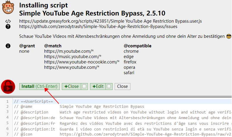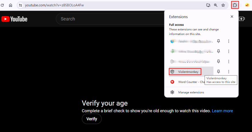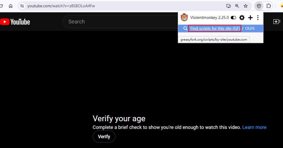 - Go to the age-restricted YouTube video and click the extension icon to open Violentmonkey.