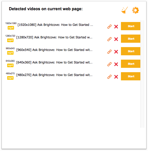 Step 5. Click the said icon in Chrome’s toolbar. In the window that shows up, you will find a list of videos with different quality levels. Here we choose the one with the best quality. Click the Start button next to it. It will start preparing the Brightcove video for download.