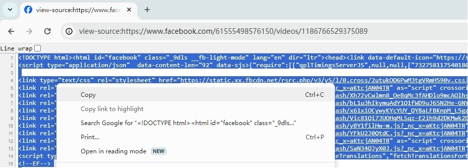 Step 3: Press Ctrl+A to select all page source code, and Ctrl+C to copy it.