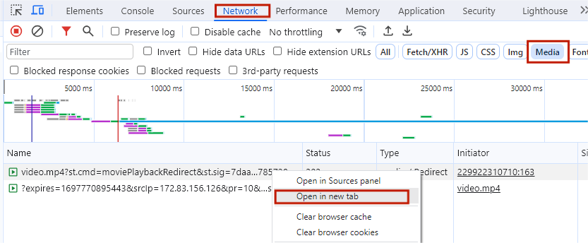 Step 3. Now refresh the video page, play the video, and you will see some files under the Media tab. This is the direct link to save the video.