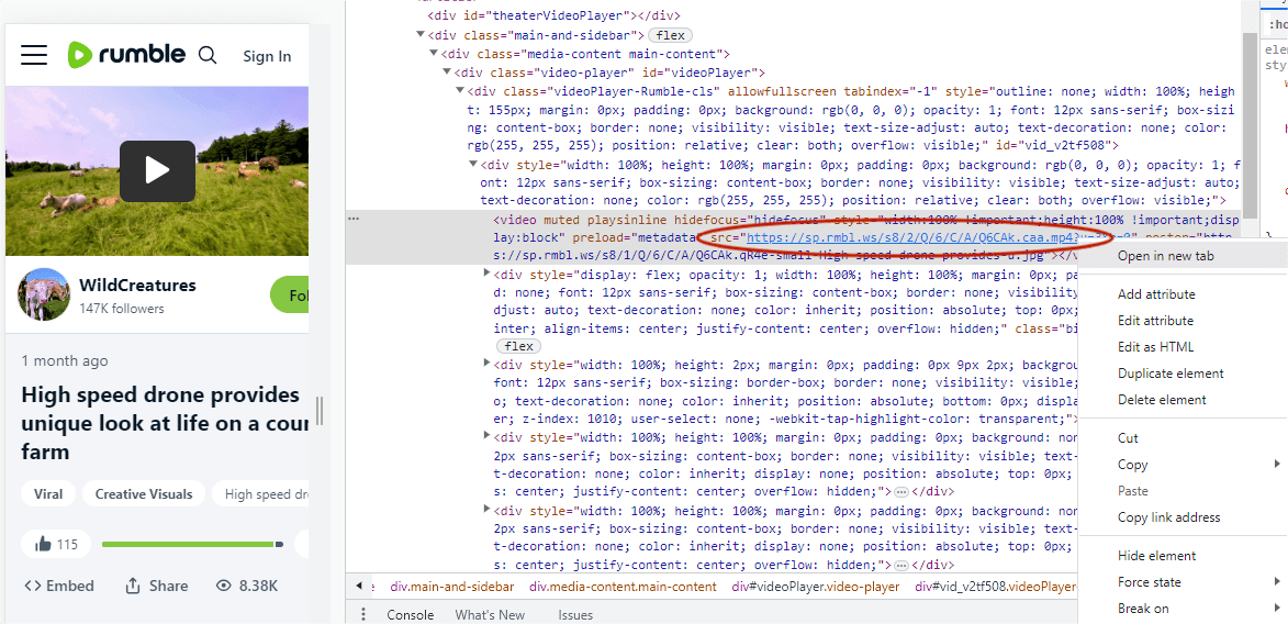 Do you know that you can download Rumble videos directly from the website? Inspect Element tool is a utility that allows you to view the underlying source code of any web page. It will show the download link for the Rumble video. This technique works only for MP4 files, which represent most Rumble videos, except for HLS videos. You can try this method on most major browsers - including Chrome, Firefox, Edge and Safari.