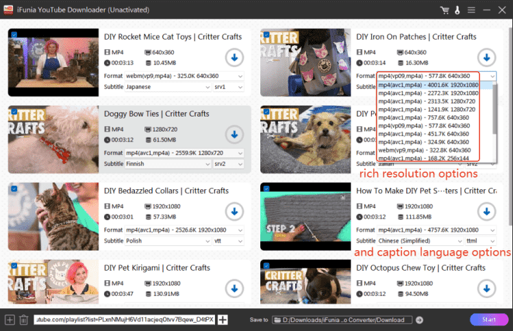 - Select an output format and a subtitle as you like. Then choose to save the downloaded video files into a destination folder below. Finally, hit on the Start button to begin the process.