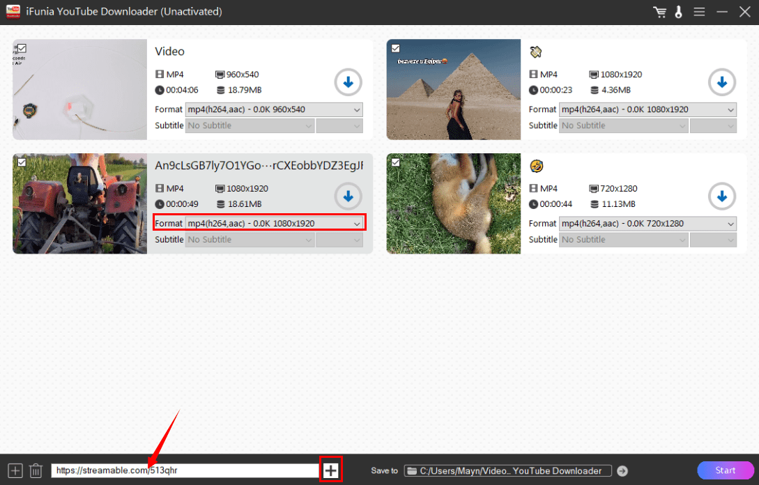 3. Paste it in the search box of iFunia, click the ➕ icon on the right hand to upload them in the program, then choose a format with a proper resolution.