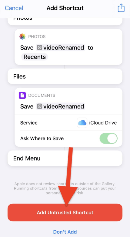2. Go to Settings → Shortcuts and hit the button Add Untrusted Shortcuts.