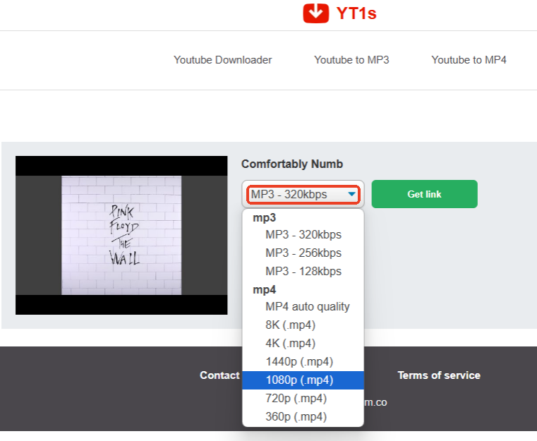 - Choose the video resolution and the format (only MP3 and MP4). Click Get link and it will directs you to an ad page, close it.