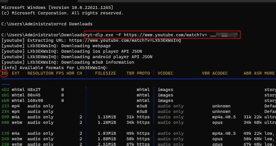- Enter the following line with your YouTube URL in the place of “YouTube URL” and press Enter on the keyboard to check the formats you can download.