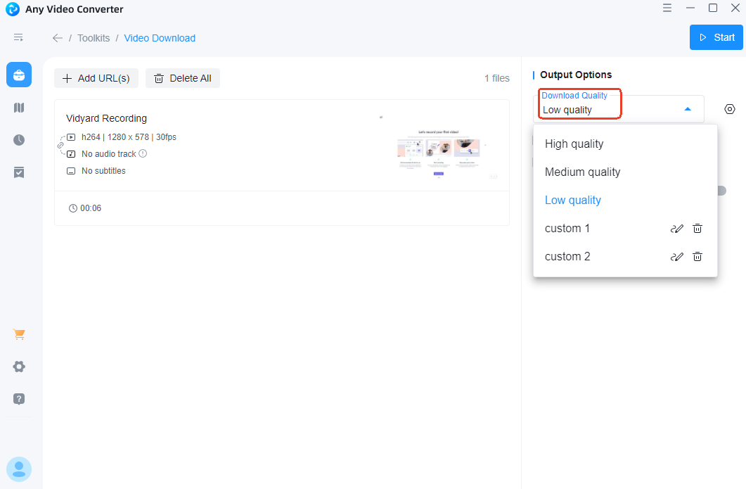 - Press Analyze to parse the Vidyard video. Choose a quality in the right panel. Finally click Start for Vidyard video download.