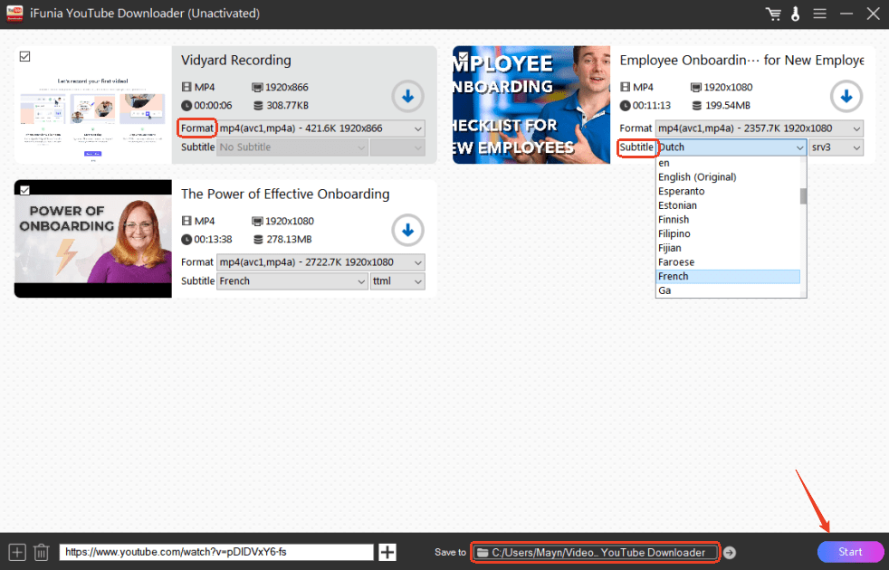 - Choose the output format and the subtitle as you need, select a destination folder and click Start to download video from Vidyard link.