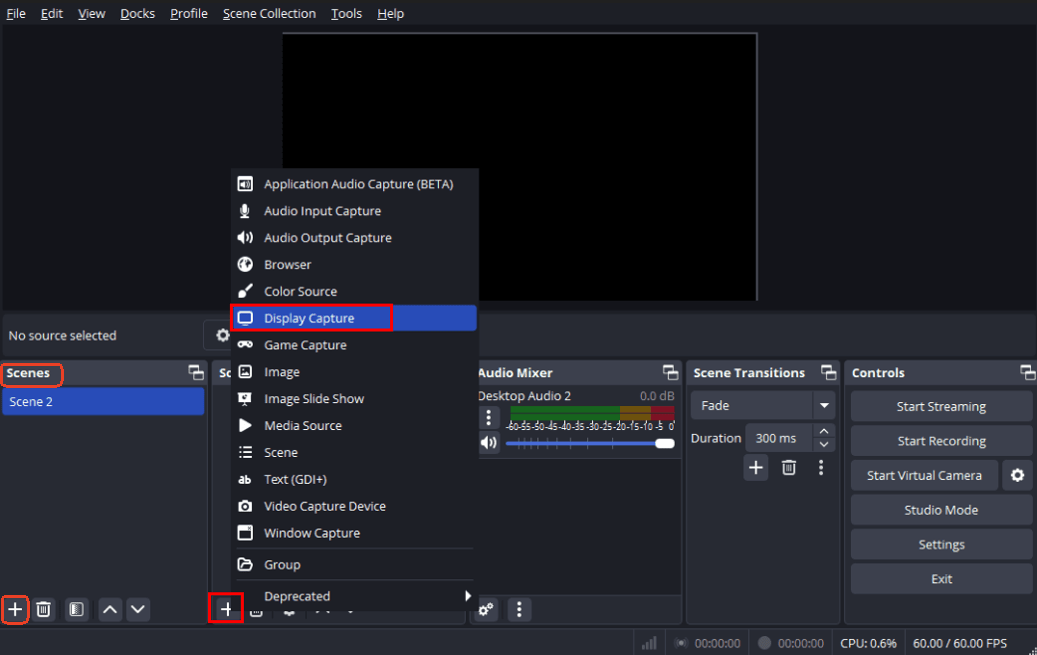 - Add a scene in Scenes dock and add Display Capture in Sources dock.