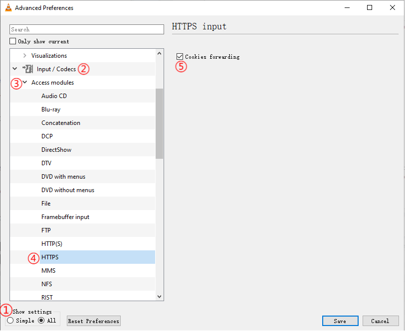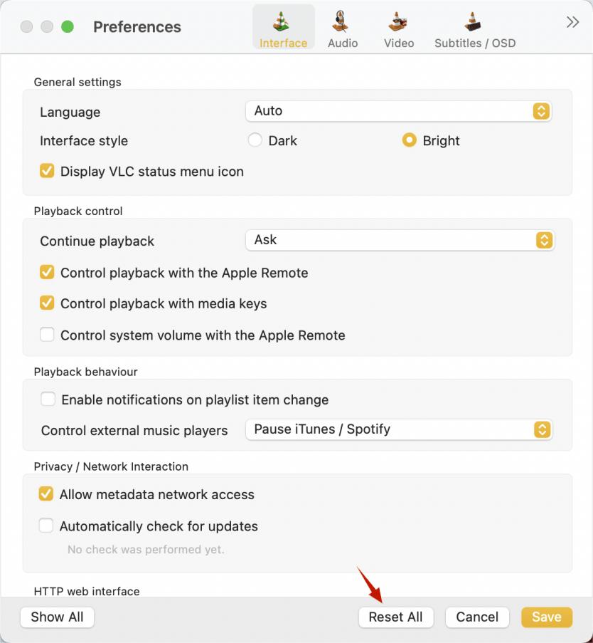 Sometimes you can reset preferences in VLC if the YouTube videos suddenly not playing in VLC. I solve the problem on Mac one time. Just open the Preferences window and click Reset All option.
