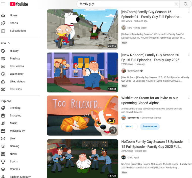You can find a great number of fan-uploaded clips of Family Guy on YouTube, the biggest streaming platform every knows. Sometimes you are lucky to find complete episodes as well. I like watching on YouTube as the clips are the highlight parts in the episodes and I get the nuances by reading the comments, it’s like a community.