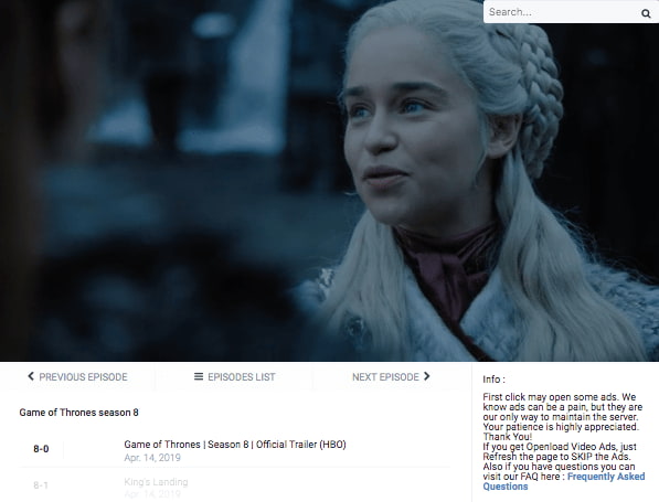 You can find all the GOT episodes from season 1 even to season 8. You don’t have to sign up any account. There may be annoying ads, but just close them when popping up and wait up for the streaming.