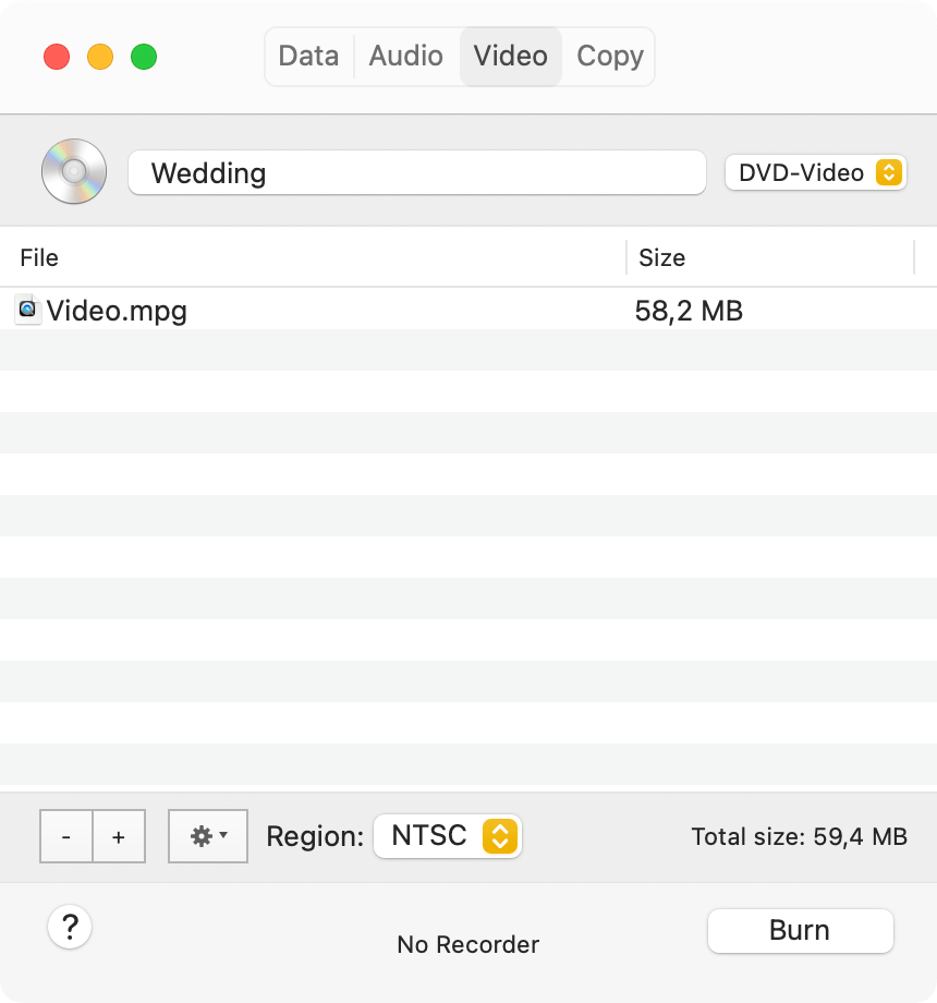 To burn a video DVD with it, simply switch to the Video tab of Burn, choose the “DVD-Video” option, then drag and drop the video into the window. Burn will automatically convert the video to the DVD format MPEG-2 (.mpg file). It will also add a DVD menu with a default theme.