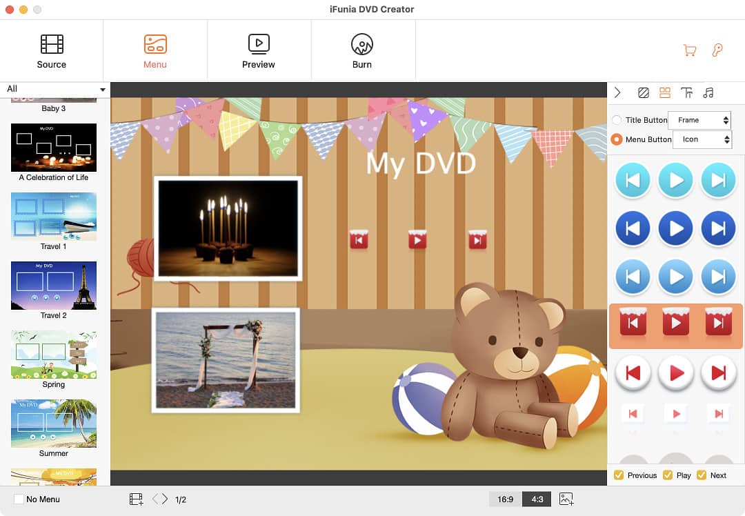 Switch to the Menu tab at the top, and select a menu template suitable for your DVD content. You can drag all elements around to adjust the layout. On the right panel, you can customize the image, title frame, menu buttons, add text and more. If you don’t want a menu, just check the “No Menu” option in the lower right corner.