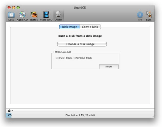 Don’t be misled by the name, LiquidCD is a popular free disc burning software for Mac that burns both CDs and DVDs. It allows users to burn personal hybrid discs (showing files on both PC and Mac), add a custom icon to the disc and burn ISO/CUE/BIN image files. If you are still using an early OS X like 10.5, it can be an easy and fast choice to handle simple video and data DVD as well as audio CDs.