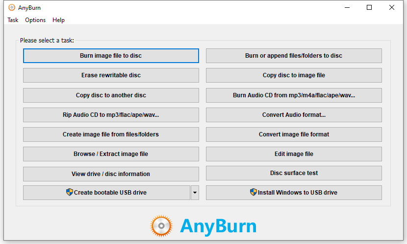 AnyBurn is a robust CD/DVD/Blu-ray burning software that comes in two versions - the Free and Pro version. The Pro version has the same features as the free one except that it can convert audio file formats and install Windows to USB drive. This free DVD burning software allows you to backup files and folders to burn data discs, create image files from files or DVD, and burn audio CD that can be played in regular CD player from MP3 files. Just select a task from the panels and burn DVD as needed.