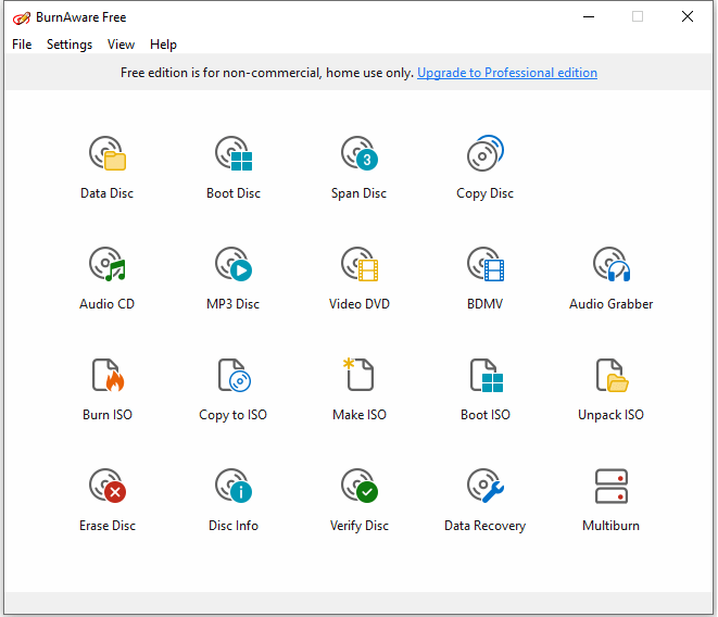 BurnAware is a feature-rich burning software for Windows operating system and is available in three editions - Free, Premium and Professional. BurnAware Free allows users to burn data discs, audio CDs as well as video DVDs that can be played on DVD players. You can also create ISO image from files and burn ISO to DVD. But this free DVD burner for Windows is designed for basic DVD burning only, it lacks DVD authoring tools to create personalized DVD menus and video editing tools.